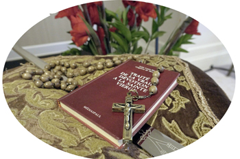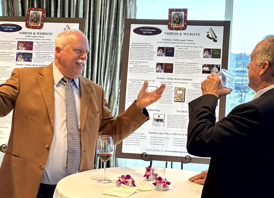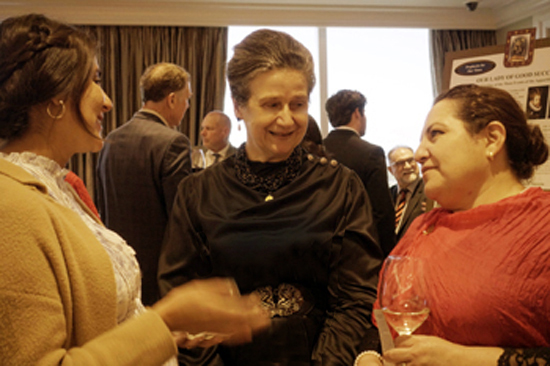 A la izquierda, la Srta. Isabel Camacho junto a nuestro tributo TIA al Prof. Plinio; arriba a la derecha, la Sra. Bárbara de la Vega expresa sus pensamientos al Sr. Mark Williams; última fila, Sra. Isabel y Sr. Steve Lewis
