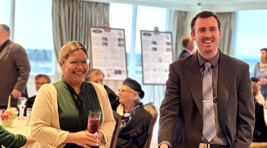 El Sr. John Lane conversa con la Srta. Aanelle Mitchell en una sala llena de invitados