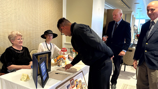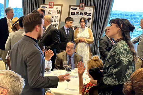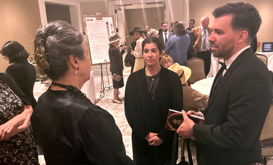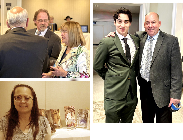 Arriba a la izquierda, el Sr. Kourash Emami, el Sr. Joseph DeClue y la Sra. Donna Emami; abajo, la Srta. Bernadette Escaro en la mesa de libros; a la derecha el Sr. Michael Saint Amand y su hijo Nathan