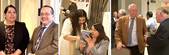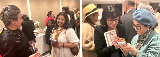 A la izquierda, la Dra. Horvat saluda a la Srta. Cristal Ramírez; a la derecha, la Srta. Michelle Jeturian y la Srta. Salwa Bachar intercambian información de contacto