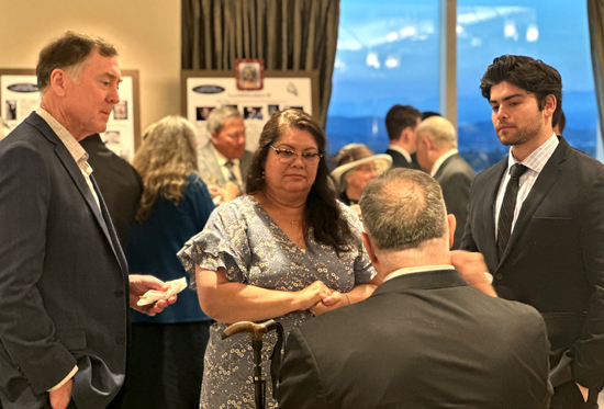 a la izquierda, la Sra. Nora Tamayo y su suegro el Sr. James Tamayo; en la mitad, la Srta. Cristal Ramírez conversa con la Srta. Ana Guzmán; a la derecha, el Sr. Terry Jakel y el Sr. Patrick Fealy
