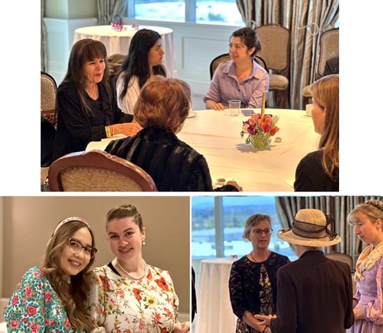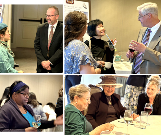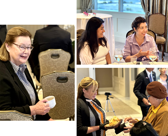 A la izquierda, la organizadora de Ecclesia Militans de San Diego, la Sra. Diane Chapman, fila superior a la derecha, la Srta. Citlali Olivares y la Srta. Yesenia Salamanca; abajo a la derecha, La anfitriona del rancho, Alyson Carpenter, ofrece un hors d'oeuvre a la invitada de TIA, la Sra. Lita Farag