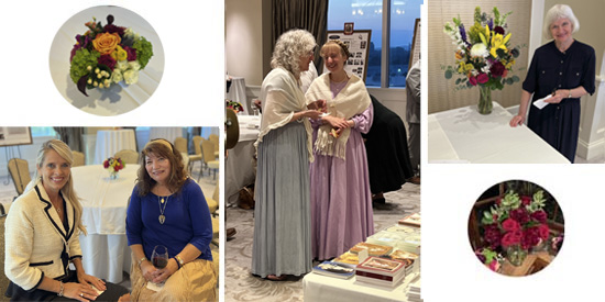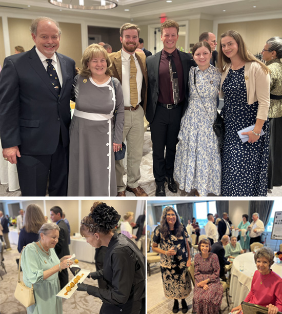 Arriba a la izquierda: la Sra. Lanier Hartnagle, quien arregló las flores, descansa un momento antes de la llegada de los invitados con la Srta. Karen Evans, voluntaria de TIA; al centro, la Sra. Eileen Savelkoul de Dakota del Norte conversa con la Srta. Rachel Lozowski; a la derecha, la Sra. Ellyn Miller en la mesa de registro.