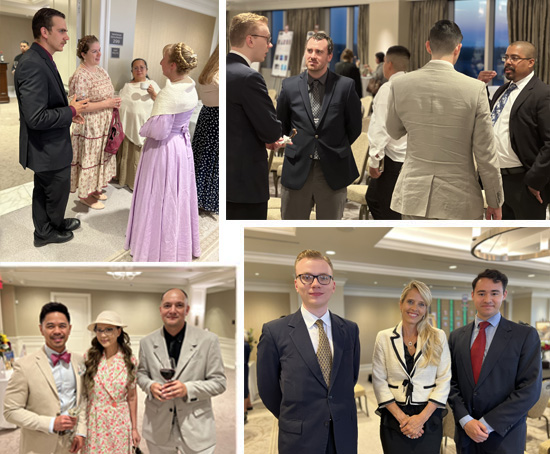 Fila superior: El Sr. y la Sra. Joseph y Rosemarie Blaszak conversan con la Srta. Rachel Lozowski, con la Srta. Bernadette Escaro al fondo; el Sr. Mark Williams conversa con el Sr. Jason Runkle, y el Sr. Nicholas Bassirpour con el Sr. James Tamayo Jr.; segunda fila: el Sr. y la Sra. Phong y Stacy Le con el Sr. Joseph Eastwood; el Sr. Williams, la Sra. Lanier Hartnagle y el Sr. Michael Aguilera