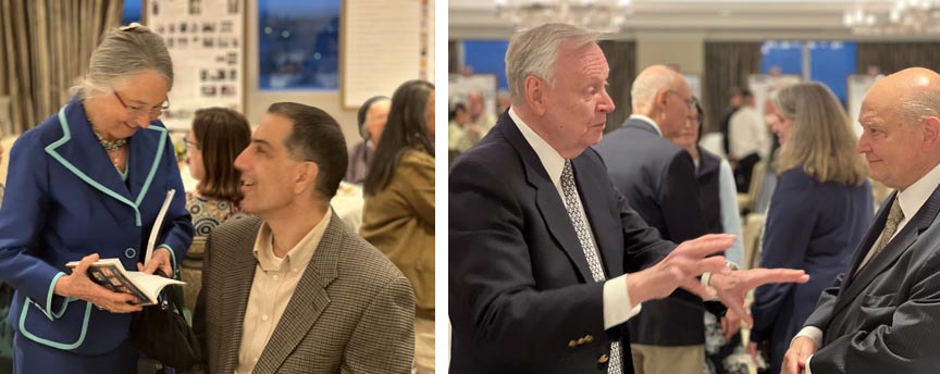 La Sra. Charlotte Lear muestra un libro al Sr. Eric Grywalski; a la derecha, el Sr. Larry Richardson conversa con el Sr. Atila