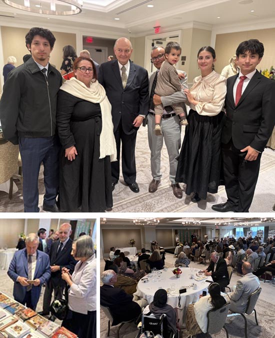 Fila superior: el Sr. Karol Arambula y su madre, la Sra. Rocío, el Sr. Atila, el Sr. Ricardo Arambula y su nieto, la Sra. Carmen Renteria y el colaborador de oficina de TIA, el Sr. Isaías Arambula; segunda fila izquierda: el Sr. Julio Hurtado muestra al Sr. y la Sra. Chris y Teresa Enerson varios de los libros que publicó en Colombia; segunda fila derecha: una mesa lateral de invitados escucha los discursos