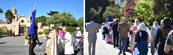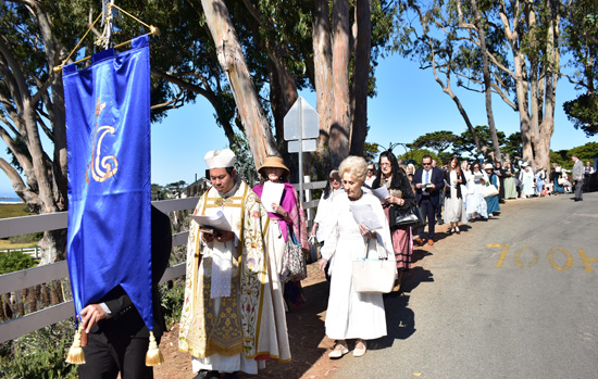 A la mañana siguiente, los peregrinos se reunieron de nuevo en la encantadora Playa Carmel para rezar el Rosario, mientras ascendíamos en procesión la colina donde se colocó la primera Cruz en el norte de California durante la expedición terrestre de 1769 que buscó la Bahía de Monterey.