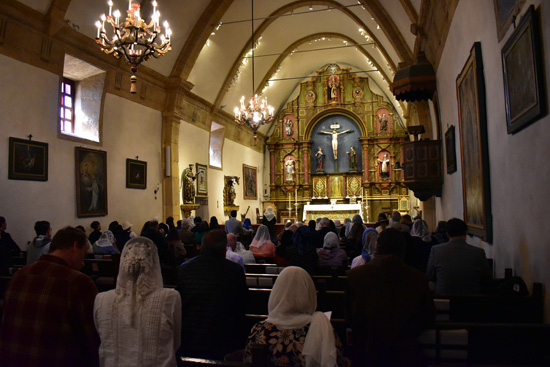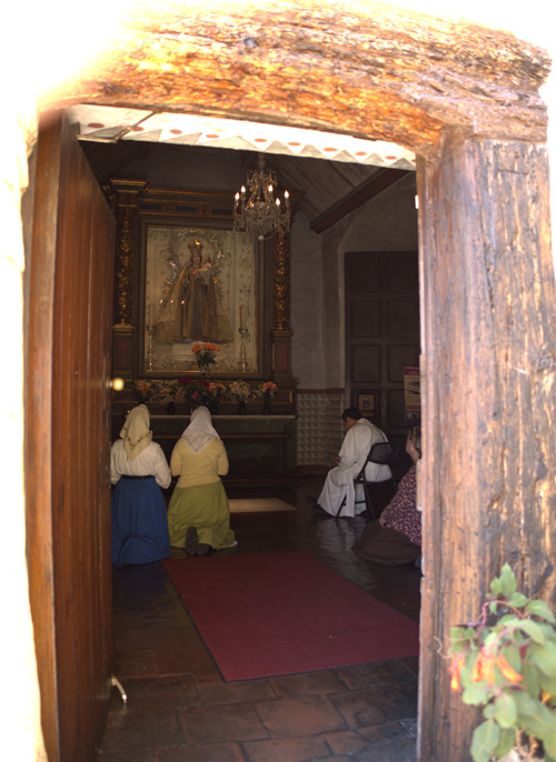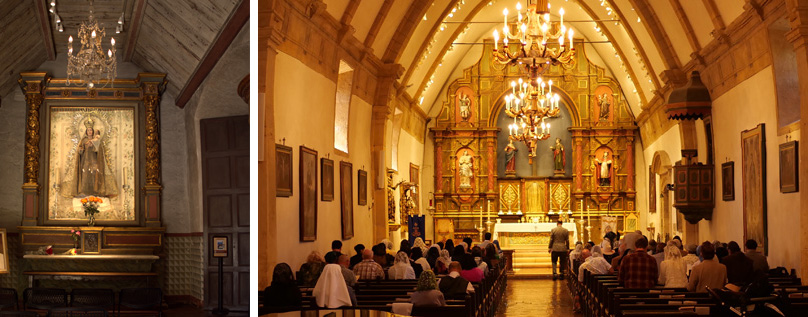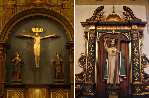 Una conmovedora escena de crucifixión se encuentra sobre el Altar donde, en tiempos del Padre Serra, estuvo Nuestra Señora de Belén; frente a la capilla de Belén se encuentra un triunfante Cristo Rey colonial que reina sobre la sociedad con Su Cruz.