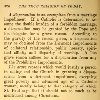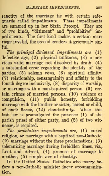 “Para asegurar el bienestar espiritual y temporal de sus hijos, la Santa Iglesia ha protegido la santidad del vínculo matrimonial con ciertas salvaguardas llamadas impedimentos. Estos impedimentos se resumen en su Sexto Precepto (observar las leyes de la Iglesia sobre el Matrimonio).