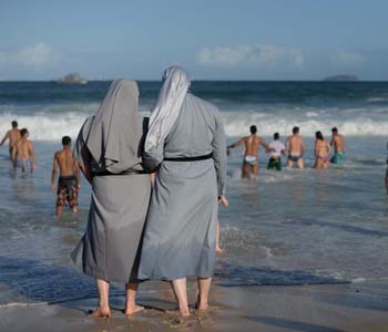 Monjas católicas observan con complacencia a jóvenes casi desnudos deleitarse con las olas en la JMJ...