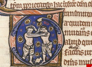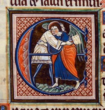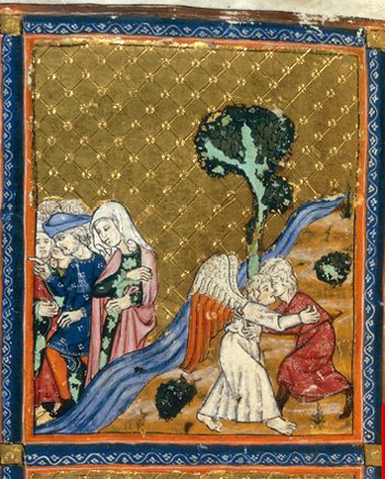 Una representación común en los manuscritos medievales era la de Jacob luchando con el Ángel. Vale la pena notar que Jacob siempre está vestido con una túnica sencilla, la prenda del día, y no con las ropas inmodestas que usaban los griegos.