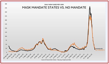 La línea naranja muestra la infección por COVID-19 en los estados que no exigieron el uso de mascarillas; la línea negra, en los estados que sí lo hicieron. No hubo diferencia: Las mascarillas no funcionaron