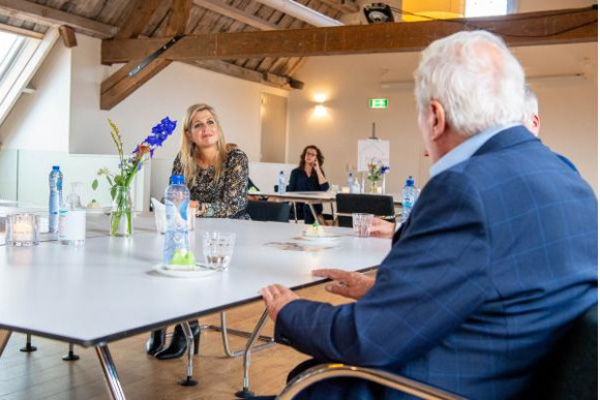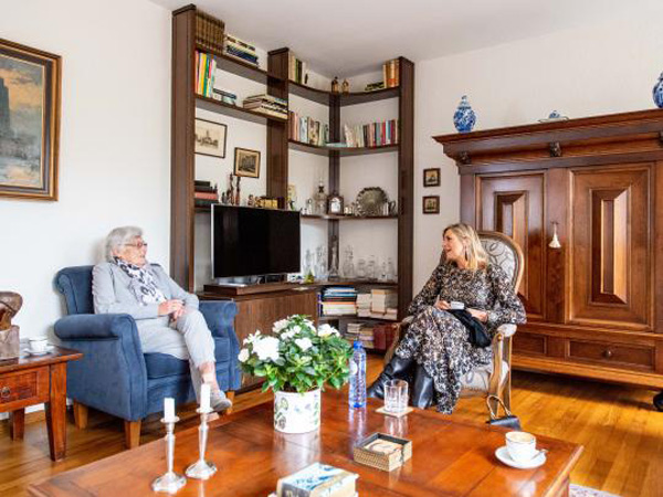 Acompañando a un cuidador, la reina Máxima de los Países Bajos visitó a algunos ancianos enfermos en las afueras de Rotterdam el 8 de septiembre de 2020. Arriba , , charla con Adrie Busink, de 80 años, que tiene una infección pulmonar además de la enfermedad de Parkinson.La anciana se mostró muy complacida y sorprendida cuando abrió la puerta a su cuidador diario y encontró a la reina Máxima a su lado. Luego de ofrecerle a la Reina una taza de café, la dama relató sus dificultades.