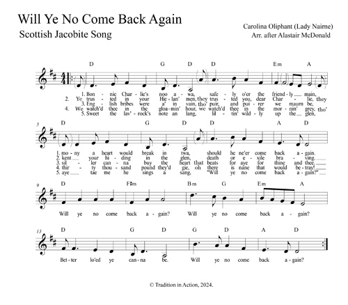 Will Ye No Come Back Again, también conocido como Bonnie Prince Charlie, es un poema escocés escrito por Carolina Oliphant (Lady Nairne), con una melodía popular escocesa. La canción describe el levantamiento jacobita de 1745, en el que el pretendiente católico al trono, el príncipe Carlos Eduardo Estuardo, intentó recuperar el trono británico para su padre, el rey James Francisco Eduardo Estuardo. Aunque noble y heroico, el levantamiento no tuvo éxito y los británicos establecieron una recompensa por la captura de Carlos. Carlos se vio obligado a huir a Francia y más tarde