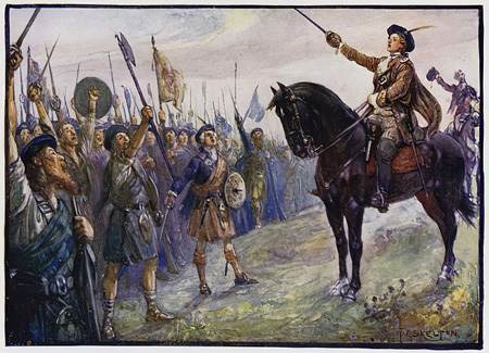 Bonnie Prince Charlie, de 25 años, dirigiéndose a sus tropas, Levantamiento jacobita de 1745.