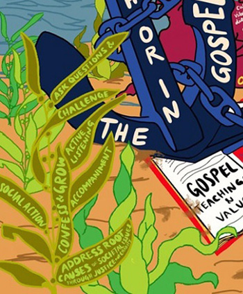 La imagen también incluye algas marinas con siete ramas, las siete posiblemente imitando los siete sacramentos. Los siete sacramentos progresistas parecen ser "confesar y crecer", "hacer preguntas", "desafiar la escucha activa", "acompañamiento", "acción social" y "abordar las causas profundas de los problemas sociales a través de la justicia y la caridad".