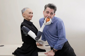 Sophia la Robot le da una manzana al fundador de Hanson Robotics, David Hanson, posiblemente aludiendo a que Eva le dio a Adán la fruta prohibida.