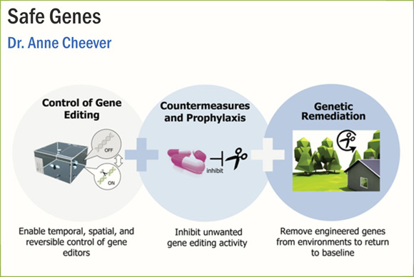- El programa Safe Genes apoya la protección de la fuerza y la salud y preparación militar al proteger a los miembros del Servicio contra el mal uso accidental o intencional de las tecnologías de edición del genoma. El trabajo adicional aprovechará los avances en la tecnología de edición de genes para acelerar el desarrollo de tratamientos profilácticos y terapéuticos avanzados contra los editores de genes. Los avances dentro del programa garantizarán que Estados Unidos permanezca a la vanguardia en el campo de la edición del genoma, ampliamente accesible y que avanza rápidamente.
