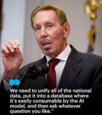 - Larry Ellison, fundador y director de tecnología de Oracle, propone unificar todos los datos estadounidenses (incluido el ADN) en centros de datos de inteligencia artificial para "mejorar vidas" mediante análisis predictivos y vigilancia.