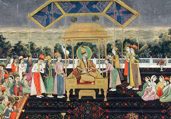 El emperador mogol Mohammed Shah Rangila en su maravilloso trono del pavo real