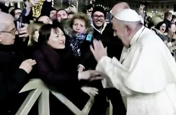En la noche del 31 de diciembre de 2019, una mujer china agarró la mano del Papa en su paseo por la Plaza de San Pedro y le suplicó ayuda para los católicos chinos que "están perdiendo la fe". Se puso furioso y