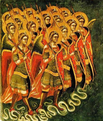- Según San Gregorio Magno ( Homilía 34 sobre los Evangelios) sus rangos en orden ascendente son: 1. Angeli (Ángeles); 2. Archangeli (Arcángeles); 3. Virtudes (Virtudes); 4. Potestates (poderes); 5. Principatus (Principados); 6. Dominationes (Dominaciones); 7. Throni (Tronos); 8. Querubines (Querubines); 9. Serafines (Serafines). Todos estos rangos, excepto los Principados, se mencionan mutatis mutandis en los Prefacios del tradicional Misal Romano . Aunque no todos los rangos se mencionan por su nombre en cada prefacio, todos los prefacios contienen una referencia específica a algunos de ellos.