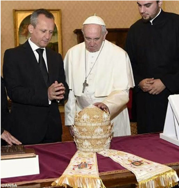 Francisco, visiblemente disgustado, recibe una tiara del primer ministro de Macedonia; nunca la usó