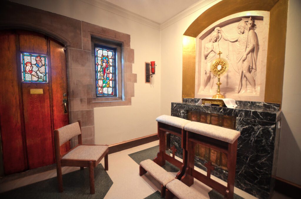 Una Adoración Eucarística progresista; otra aquí; abajo, Una capilla lateral fría y desolada en una iglesiaNovus Ordo