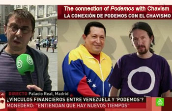 Los periodistas informan sobre la conexión entre Chávez y Podemos ; izquierda , Monedero, derecha , con Iglesias