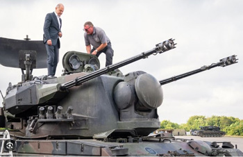 El canciller alemán Olaf Scholz inspecciona un tanque de última generación preparado para la guerra