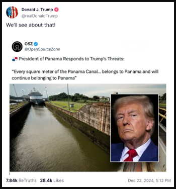 - El presidente electo Donald Trump, que asumirá el cargo en enero de 2025, hizo hincapié en una política exterior que priorice a Estados Unidos y priorice la seguridad nacional y económica de Estados Unidos. Se negó a descartar la coerción militar o económica para asegurar el control del Canal de Panamá y Groenlandia, a los que calificó de activos estratégicos vitales.
