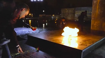 Los invitados fueron tratados generosamente, arriba, pero inducidos a dejar flores en una tumba a los soldados rusos, abajo
