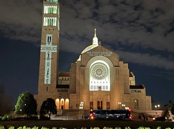 Mensajes que expresan su apoyo al derecho al aborto se proyectaron en la Basílica del Santuario Nacional de la Inmaculada Concepción en Washington, D.C., el jueves 20 de enero de 2021. Los mensajes fueron parte de una protesta organizada por el grupo de defensa liberal Catholics for Choice. Foto de RNS por Jack Jenkins.