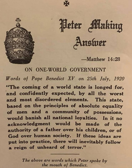 Recientemente encontré en Yore Sitio web para niños esta cita del Papa Benedicto XV en 1920 sobre el Nuevo Orden Mundial. La previsión de ese Pontífice es bastante impresionante.
