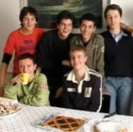En la primera foto, está vestido de rojo, arrodillado segundo desde la derecha. En la segunda foto, está de negro, de pie segundo desde la izquierda.
