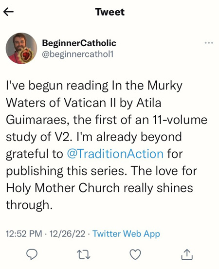 He empezado a leer "En las Aguas Turbias del Vaticano II" por Atila Guimaraes, el primero de un estudio de 11 volúmenes sobre el V2. Estoy más que agradecido con Tradition in Action por publicar esta serie. El amor por la Santa Madre Iglesia brilla realmente