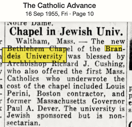 Las capillas se abrieron en 1955 y el notorio obispo liberal Richard Cushing (quien logró la excomunión del padre Leonard Feeney) consagró la capilla “católica”.