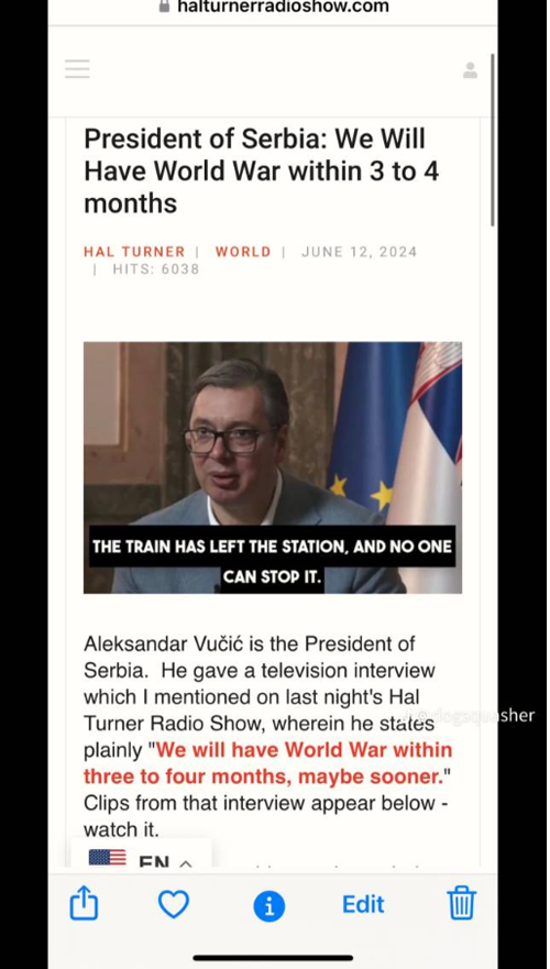 Normalmente no escucho el programa de radio de Hal Turner, pero un amigo me envió esta captura de pantalla. En el programa se informó que el presidente serbio afirmó que la Tercera Guerra Mundial se producirá en tres o cuatro meses.