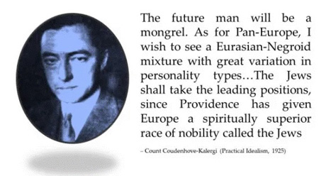 El conde Coudenhove-Kalergi es famoso por sus declaraciones anticristianas y judeófilas. Su famoso "Plan Kalergi" de migración masiva para genocidio a la raza blanca es más conocido en Europa que en Estados Unidos.