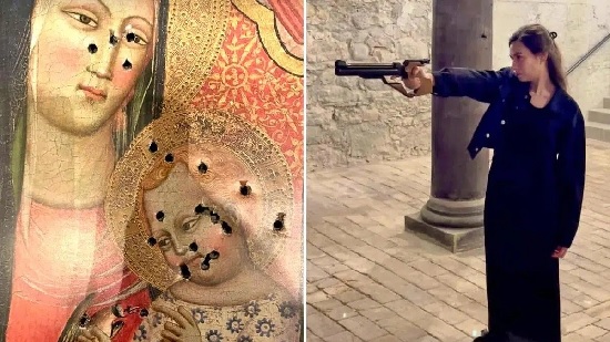 Una política nacida musulmana en Suiza dispara contra una imagen de Nuestra Señora y el Niño Jesús durante una práctica de tiro para ayudarla a "desestresarse." Algunos disparos impactaron sus rostros. Hubo tanta indignación por sus acciones blasfemas que publicó una disculpa y renunció. Fingió que no le molestó ni siquiera comprobar cuál era la imagen a la que estaba disparando...