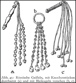 Cuando analizamos la parte posterior del Santo Sudario de Turín, vemos tres tipos diferentes de azotes utilizados para la Flagelación (ver imagen a la derecha). Dos de esos azotes tenían mangos cortos, uno con tres correas de cuero con múltiples huesos pequeños, otro con siete correas de cuero rectas con dos pequeñas bolas de plomo en el extremo, y un tercer azote que no tenía mango sino que formaba un anillo del que colgaban cuatro correas de cuero anudadas con huesos duros en el borde de cada una.