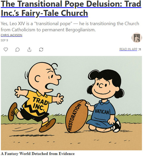 Creo que este artículo vale la pena leerlo. Otro artículo de Chris Jackson, esta vez desmantelando el mito de que el Papa León XIV será un “papa de transición” que conducirá a una “restauración”, según los conservadores moderados tradicionalistas como Peter Kwasniewski.