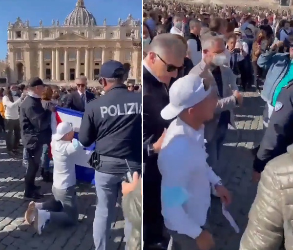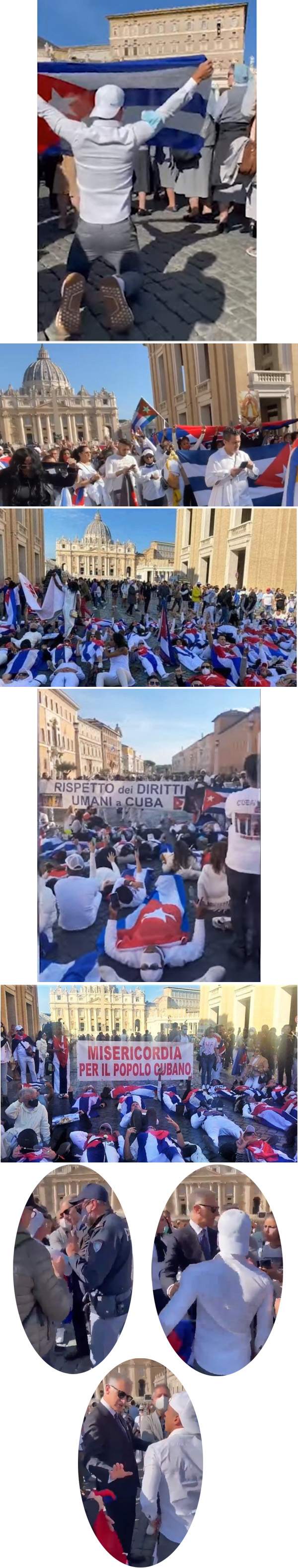 El 24 de octubre de 2021, la Policía del Vaticano prohibió a los cubanos exiliados asistir al Ángelus del Papa. Desde primera hora de la mañana hubo una prohibición explícita de permitir que los cubanos refugiados que viven en Italia para entrar en la Plaza de San Pedro, abajo, segunda a quinta filas .Un joven, sin embargo, pudo cruzar la barrera y esperó el comienzo del mensaje de lectura papal después del Ángelus . Luego, de rodillas, desplegó en silencio la bandera cubana, abajo, primera fila . Poco después, fue rodeado por la policía de seguridad del Vaticano que confiscó la bandera y lo escoltó fuera de la plaza, arriba y abajo, las últimas dos filas .