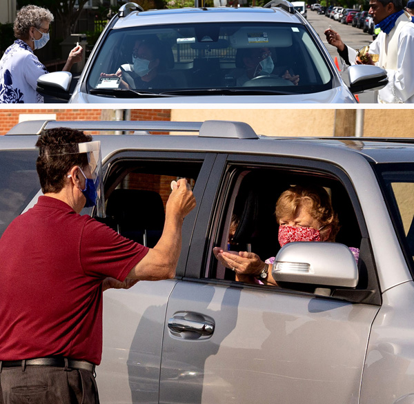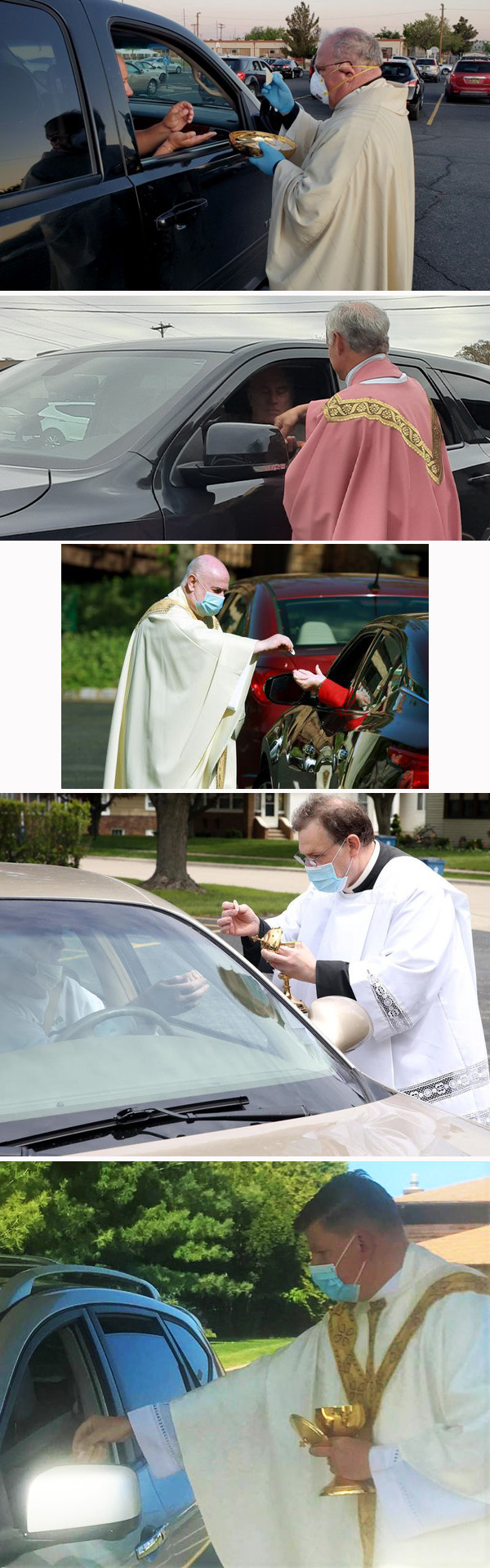 Debajo de la primera fila , el obispo Peter Baldacchino da la Comunión en el estacionamiento de la Catedral de la Inmaculada del Corazón en Las Cruces, Nuevo México; segunda fila , P. Larry LoMonaco en la Iglesia St. Aloysius en Hickory, Carolina del Norte; tercera fila , Mons. Randall Vashon, en St. Bernard Clairvaux en Bridgewater, Nueva Jersey; cuarta fila , P. Gary Blake de la Iglesia Holy Family en Oglesby, Illinois; última fila , P. John Razembajgier en la parroquia Madre de Dios en Hillsborough, New Jersey.