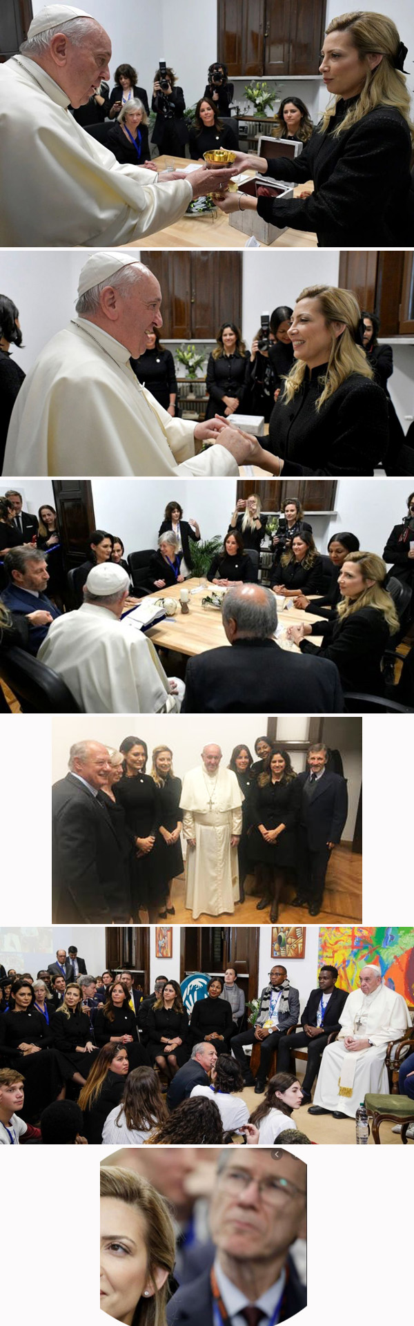 Las primeras cuatro filas a continuación representan la reunión con las Primeras Damas; en la cuarta fila, tercera desde la izquierda , podemos reconocer a Michelle Bolsonaro, Primera Dama de Brasil, luego a Fabiola Yañez a la derecha del Papa Francisco, Silvana López, Primera Dama de Paraguay, Kim Simplis-Barrow, Primera Dama de Belice, y María Juliana Ruiz, Primera Dama de Colombia. Las otras personas en la foto son funcionarios de Scholas Occurrentes .