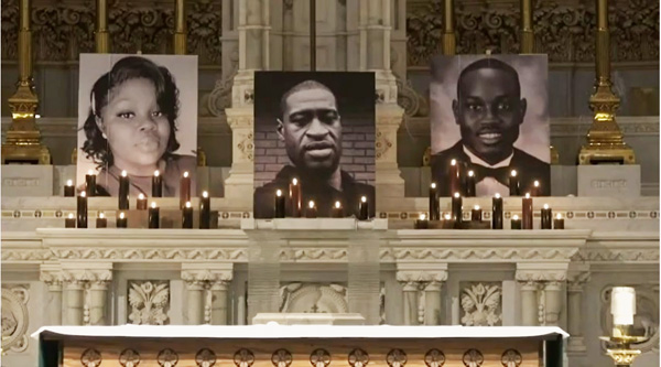 Ves arriba el altar principal de la iglesia San Francisco Xavier en Nueva York. En lugares normalmente reservados para imágenes de santos, se ven en cambio las fotos de, de izquierda a derecha , Breonna Taylor, George Floyd y Ahmaud Arbery, tres personas negras que murieron durante redadas policiales contra actividades delictivas en diferentes ocasiones este año. Debajo de cada foto se encendieron velas votivas en el altar para reforzar la idea de que son mártires.El 23 de agosto de 2020, estas fotos presidieron una misa pronunciada por el p. Kenneth Boller, S.J., debajo de la primera fila . Aunque la iglesia estaba vacía (debido a la manía de Covid-19), la ceremonia se grabó en video y, por supuesto, se usó con fines de propaganda.