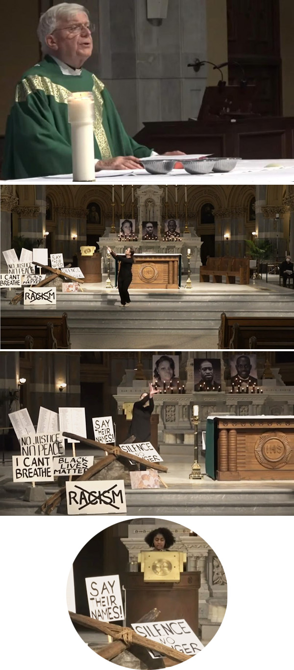 Durante la ceremonia, varios lectores subieron al podio antes y durante la misa para enviar mensajes antirracistas, pidiendo justicia y el fin de la supremacía blanca. Uno de los lectores terminó su discurso realizando una danza frente al altar, segunda y tercera filas . Los cantantes acompañados de un piano se alternaban con los lectores. Una exhibición de carteles usados en manifestaciones callejeras rodeaba una cruz colocada en los escalones del presbiterio cerca del altar.