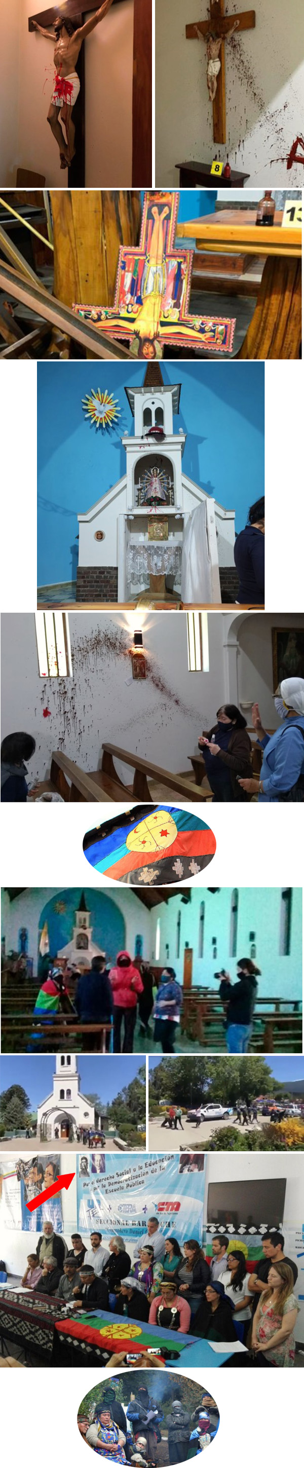 En la octava fila , una reunión del grupo Lof Lafken Winkul Mapu bajo un cartel que representa a la guerrilla comunista Che Guevara, ver flecha roja . Última fila , el campamento del grupo en la propiedad diocesana.
