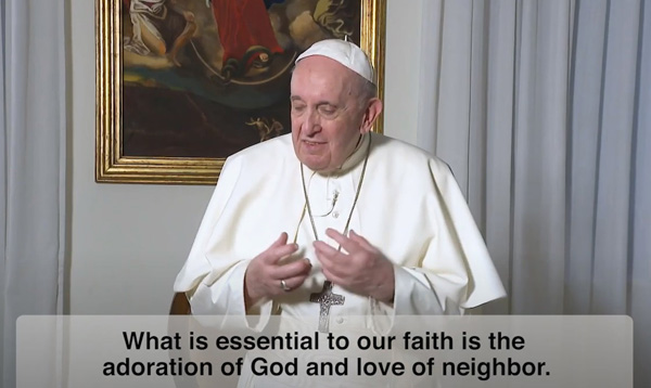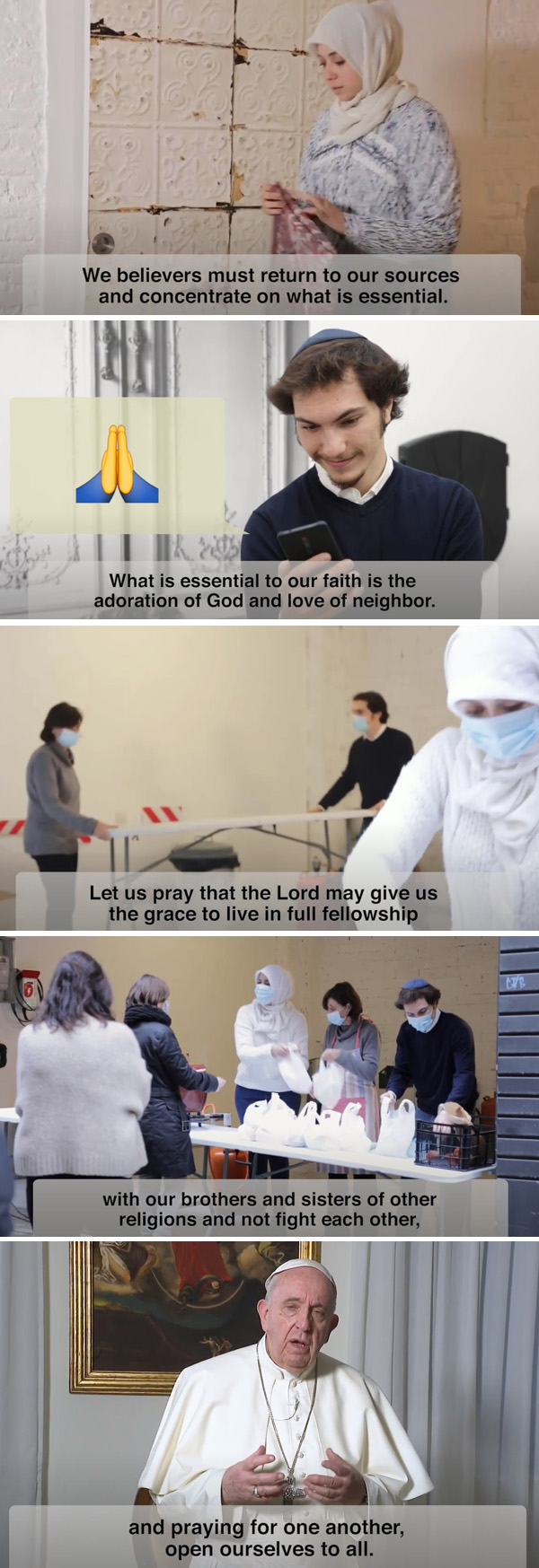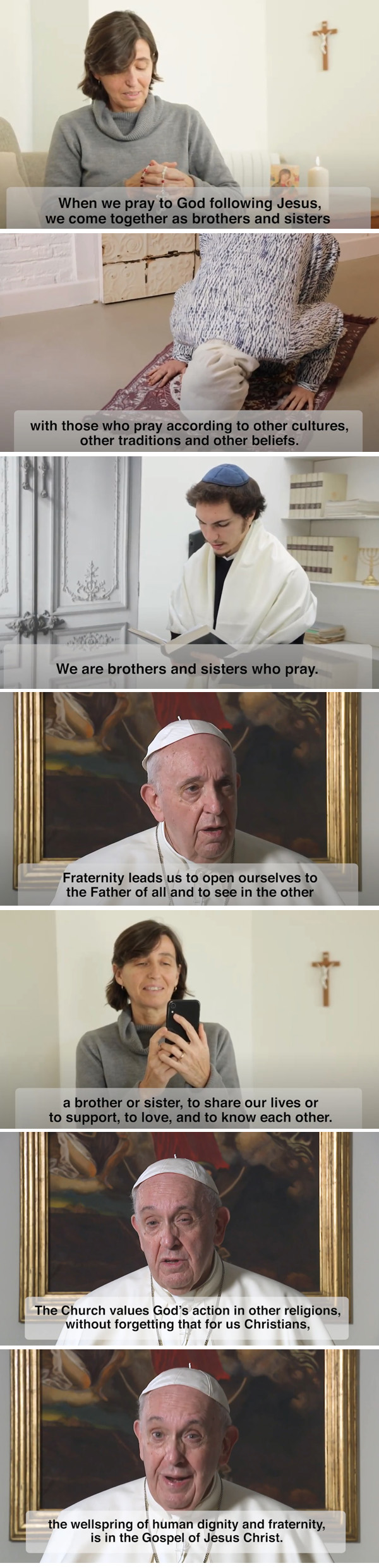 El Vaticano emitió recientemente otro video del Papa. Mientras Francisco habla, la cámara se enfoca en tres tipos de creyentes: un católico, un musulmán y un judío.El video muestra a los tres creyentes orando, comunicándose a través de teléfonos celulares y luego, haciendo trabajo social juntos.