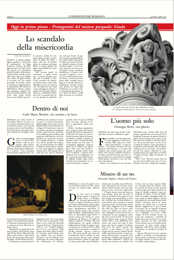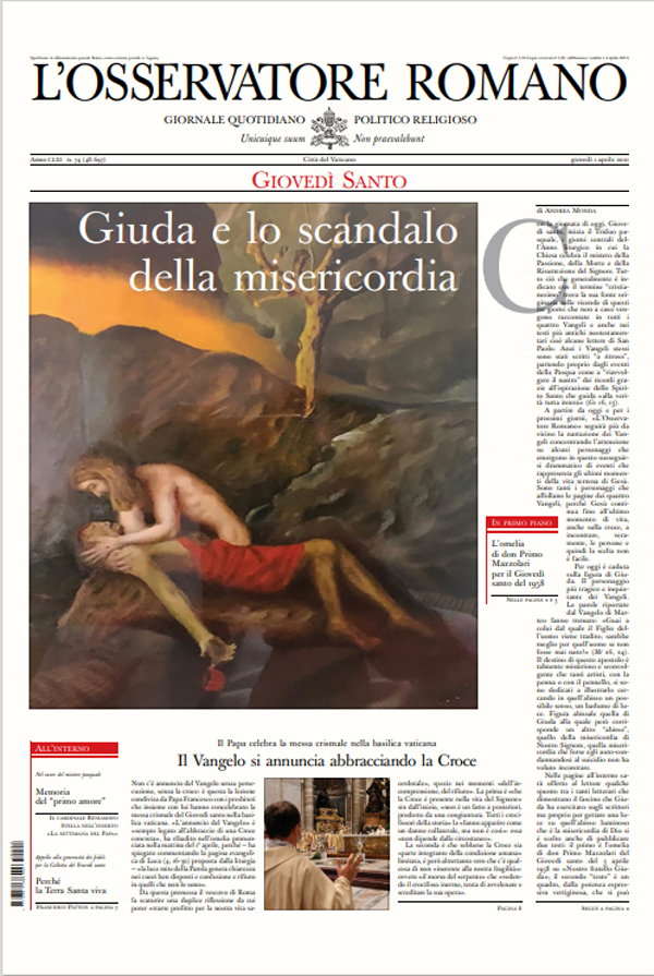 El periódico de la Santa Sede, L'Osservatore Romano, dedicó las tres primeras páginas de su edición del Jueves Santo a elogiar a Judas Iscariote.En un editorial de primera página, titulado "Judas y el escándalo de la misericordia", Andrea Monda explica que el órgano del Vaticano decidió este año honrar la figura "más trágica e inquietante" del Evangelio.